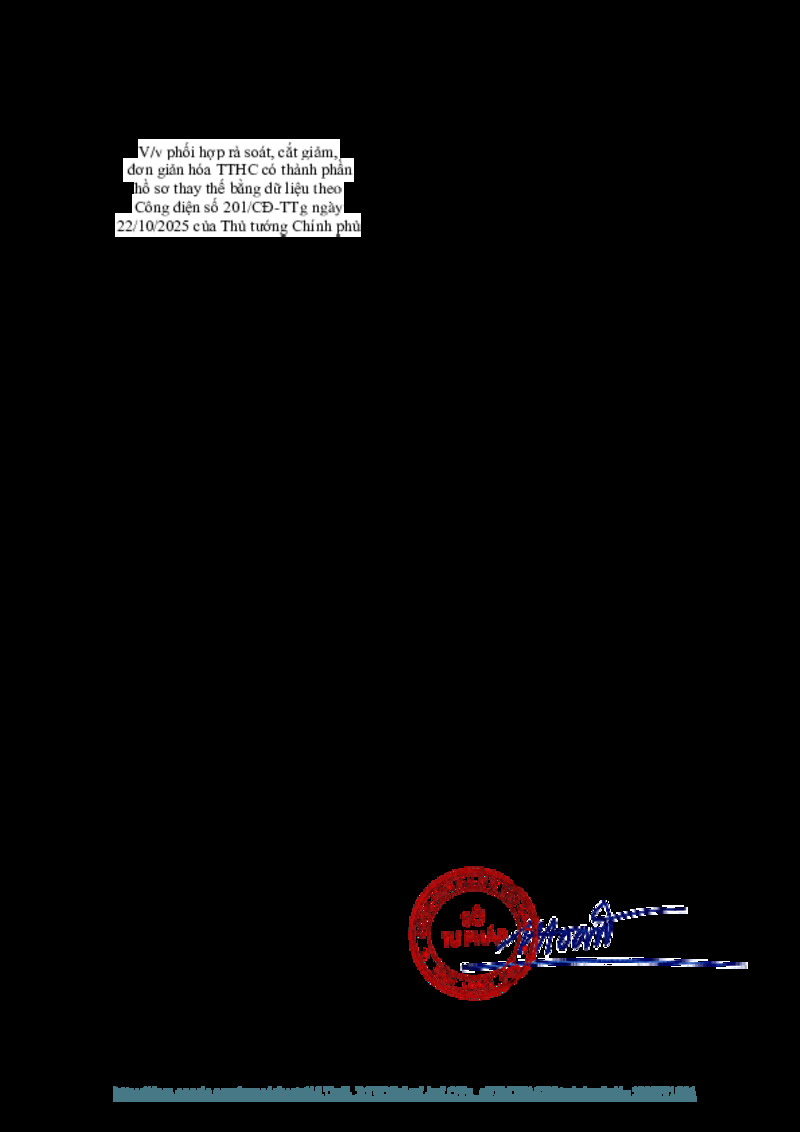 | Tiêu đề văn bản | Công văn V/v phối hợp rà soát, cắt giảm, đơn giản hóa TTHC có thành phần hồ sơ thay thế bằng dữ liệu theo Công điện số 201/CĐ-TTg ngày 22/10/2025 của Thủ tướng Chính phủ | ||