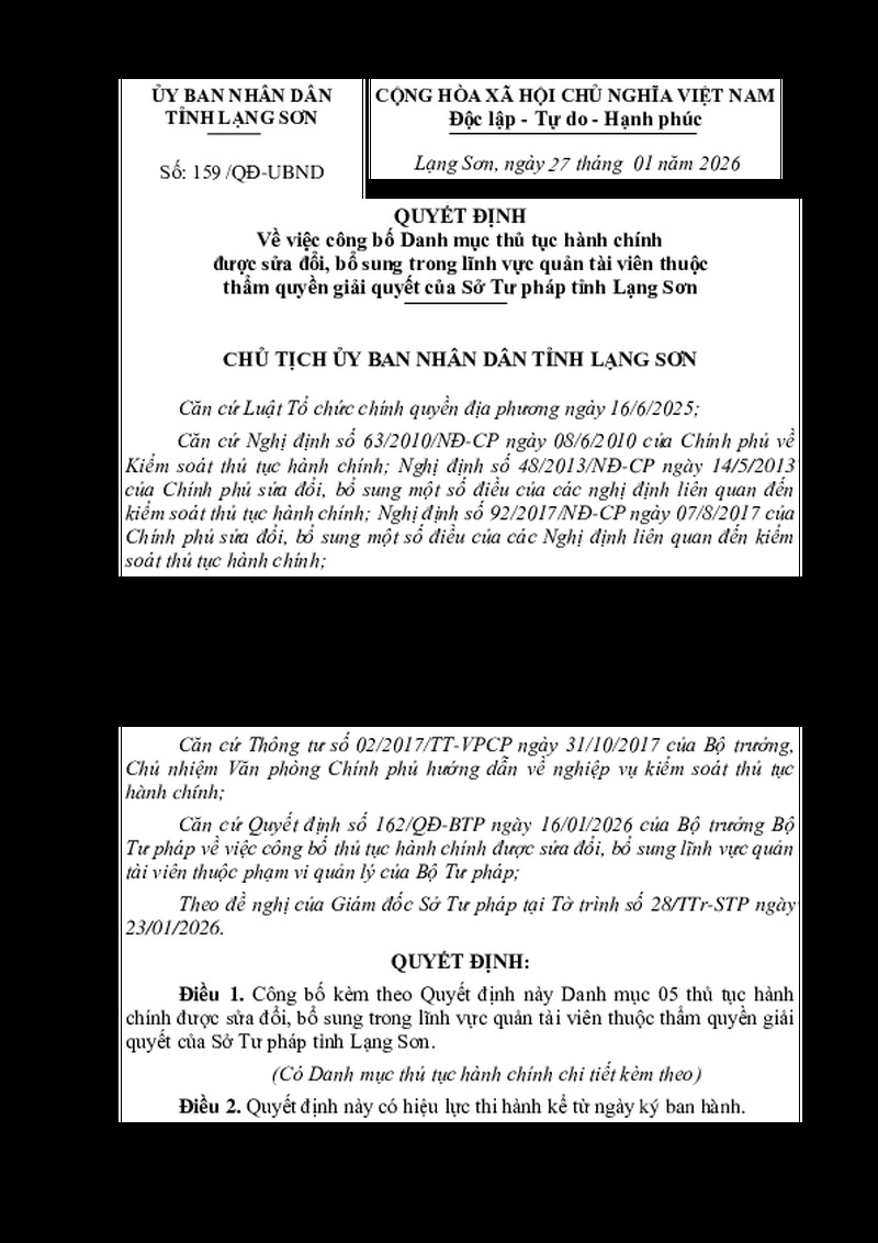 | Tiêu đề văn bản | Quyết định Về việc công bố Danh mục thủ tục hành chính được sửa đổi, bổ sung trong lĩnh vực quản tài viên thuộc thẩm quyền giải quyết của Sở Tư pháp tỉnh Lạng Sơn | ||