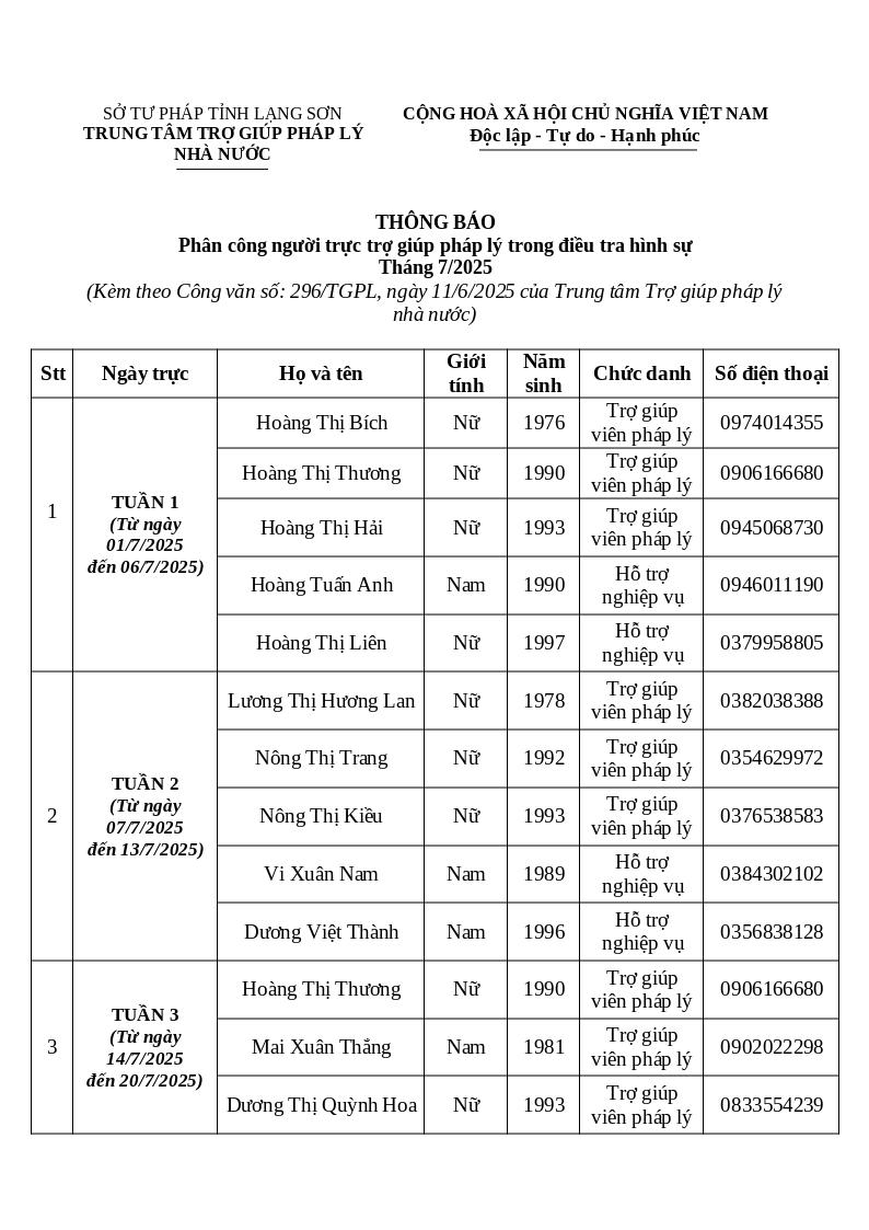 | Tiêu đề văn bản | V.v cung cấp danh sách, số điện thoại người trực, người hỗ trợ trực TGPL trong điều tra hình sự tháng 7,8,9.2025 | ||