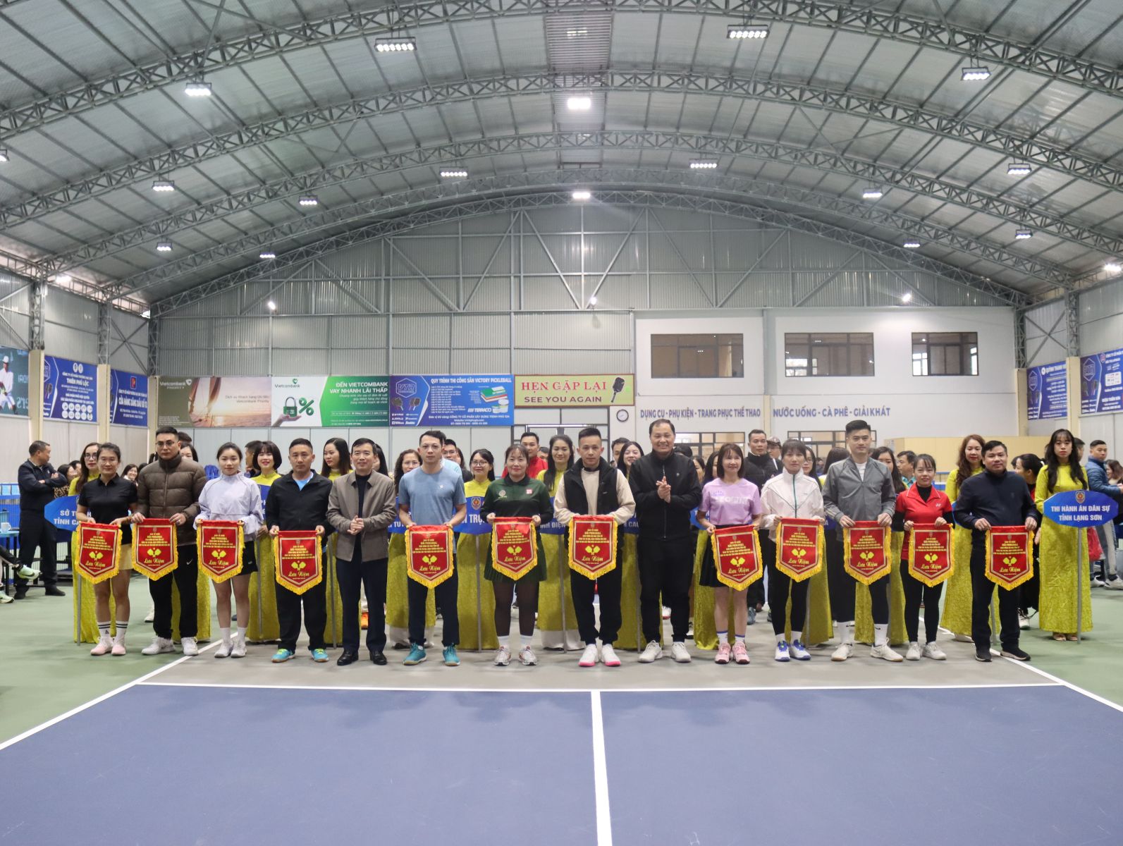 Ban Tổ chức trao cờ lưu niệm cho các đoàn vận động viên tham gia Giải Pickleball.