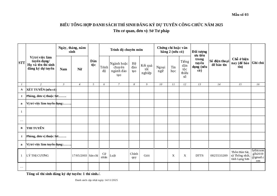 | Tiêu đề văn bản | Danh sách thí sinh dự tuyển công chức năm 2025 tại Sở Tư pháp (cập nhật ngày 14/11/2025) | ||