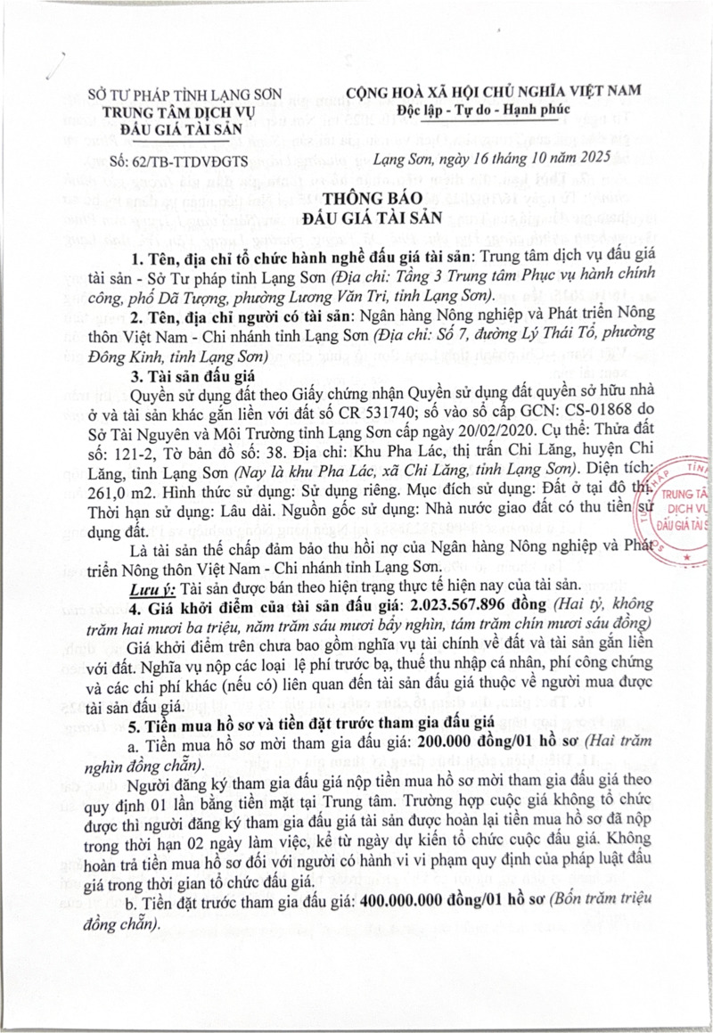 Tiêu đề văn bản | Đấu giá QSD đất Thửa đất số: 121-2, Tờ bản đồ số: 38. Địa chỉ: Khu Pha Lác, thị trấn Chi Lăng, huyện Chi Lăng, tỉnh Lạng Sơn | ||