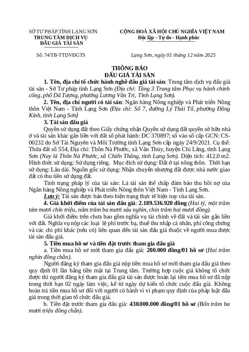 Đấu giá QSD đất Thửa đất số 554, Địa chỉ: Thôn Nà Phước, xã Vân Thủy, huyện Chi Lăng, tỉnh Lạng Sơn