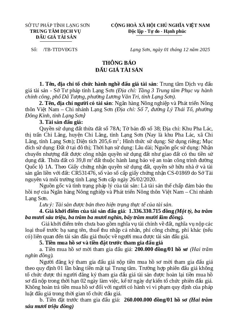 Giá khởi điểm của tài sản đấu giá: 1.336.330.715 đồng (Một tỷ, ba trăm ba mươi sáu triệu, ba trăm ba mươi nghìn, bẩy trăm mười lăm đồng).