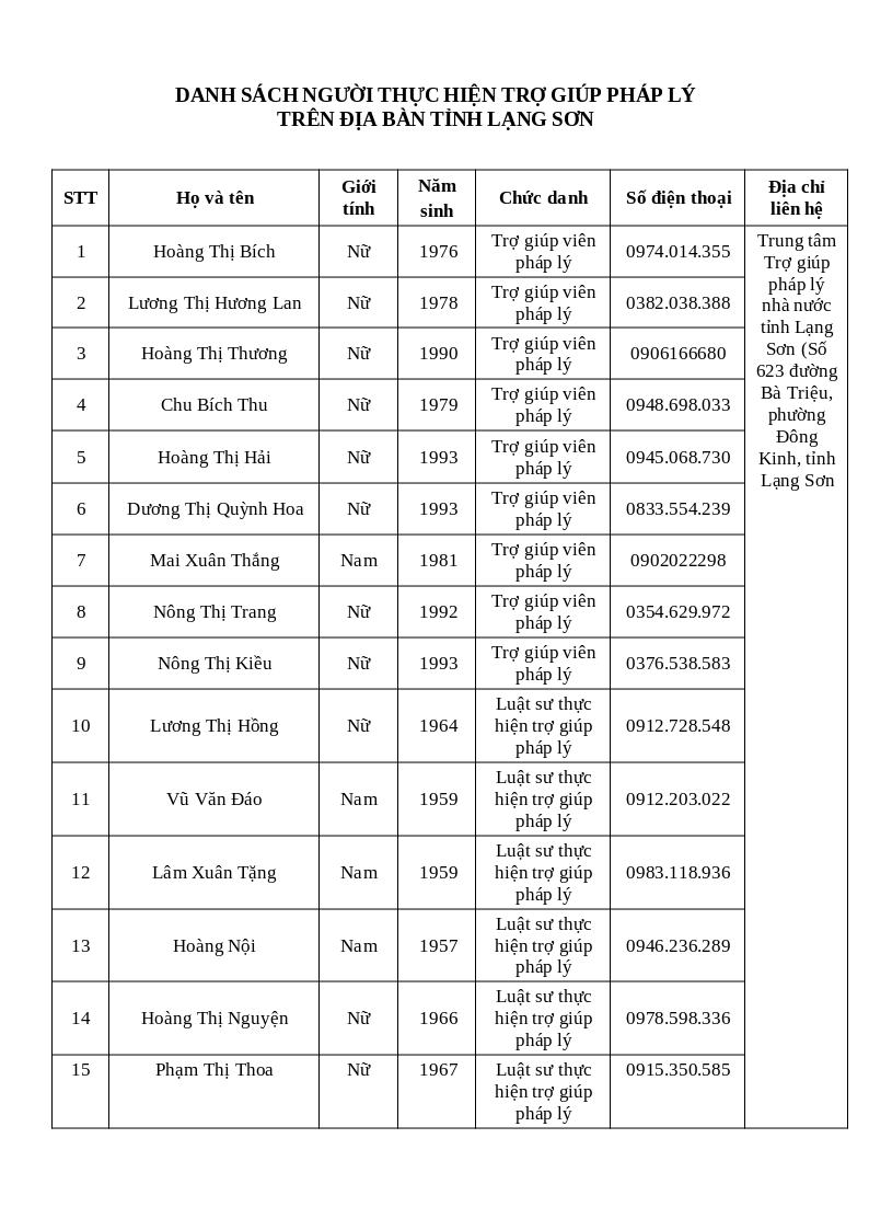 | Tiêu đề văn bản | Danh sách, số điện thoại Trợ giúp viên pháp lý, Luật sư thực hiện TGPL tại Trung tâm TGPL nhà nước tỉnh Lạng Sơn | ||