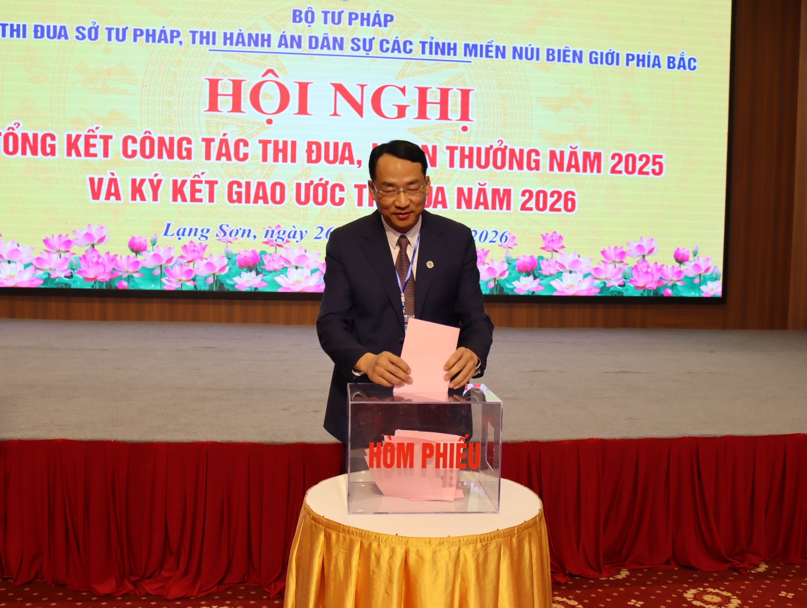 Trên cơ sở kết quả thực hiện nhiệm vụ năm 2025, Hội nghị đã tiến hành bình xét, suy tôn Sở Tư pháp tỉnh Lạng Sơn đề nghị Bộ trưởng Bộ Tư pháp tặng cờ thi đua ngành Tư pháp năm 2025. Việc bình xét được thực hiện nghiêm túc, dân chủ, đảm bảo khách quan và đúng quy trình.