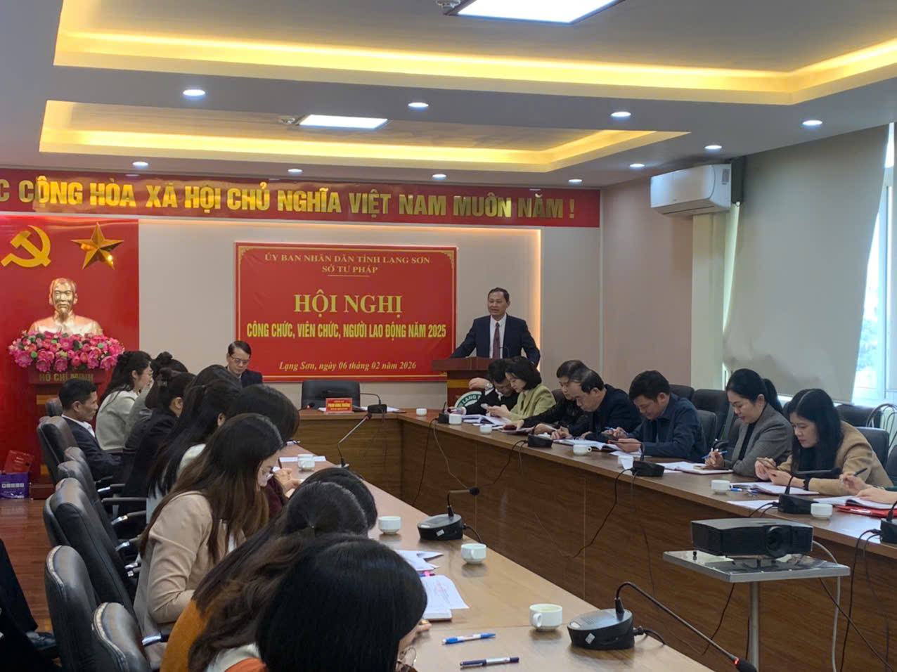 Thực hiện Luật Thực hiện dân chủ ở cơ sở năm 2022, được sự thống nhất của Chi bộ và Lãnh đạo Sở, ngày 06/02/2026, Sở Tư pháp tỉnh Lạng Sơn đã tổ chức Hội nghị công chức, viên chức, người lao động năm 2025. Hội nghị do Lãnh đạo Sở Tư pháp tổ chức và chủ trì, nhằm đánh giá kết quả thực hiện nhiệm vụ công tác năm 2025; kiểm điểm trách nhiệm của người đứng đầu trong việc thực hiện nhiệm vụ được giao; đồng thời thảo luận, thống nhất phương hướng, nhiệm vụ và giải pháp thực hiện công tác tư pháp năm 2026.