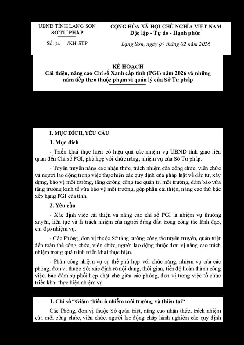 | Tiêu đề văn bản | Kế hoạch cải thiện, nâng cao Chỉ số Xanh cấp tỉnh (PGI) năm 2026 và những năm tiếp theo thuộc phạm vi quản lý của Sở Tư pháp | ||