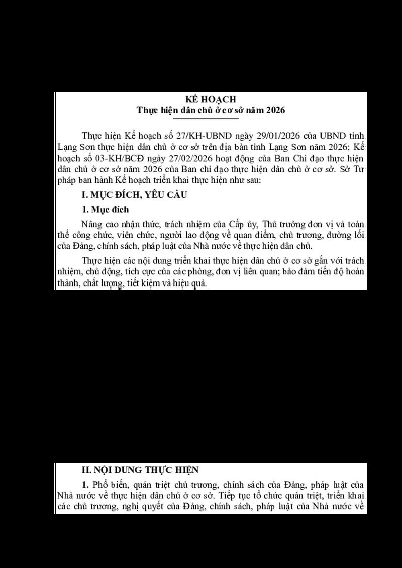 | Tiêu đề văn bản | Kế hoạch Thực hiện dân chủ ở cơ sở năm 2026 của Sở Tư pháp | ||